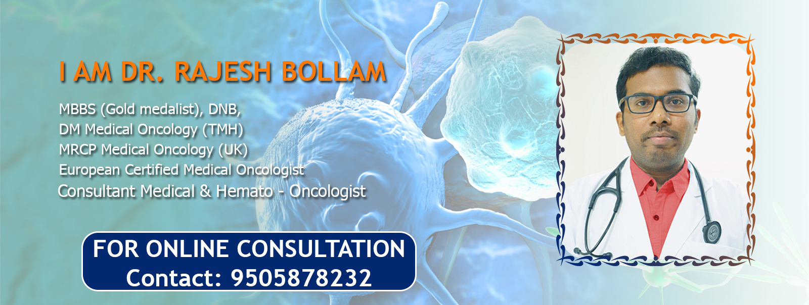 Dr. Rajesh Bollam - Sr. Consultant Hemato-Medical Oncologist and Director of Oncology, Renova Hospitals, Banjara Hills and Karkhana, Secunderabad Hyderabad. He is DM Medical and Hemato Oncologist, from Tata memorial hospital, European certified medical oncologist, Gold medalist in MBBS has been practicing for the last 11 years. He is also visiting consultant to near by places of around Hyderabad namely Warangal, Nalagonda, Hanamkonda and Miriyalguda.